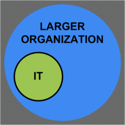 There’s an interesting paradox in the way ITIL works, however: it effects better alignment between IT and the larger organization not by more closely integrating the two, but by pushing them farther apart. ITIL takes the typical IT organization, which is often only half-heartedly or partially integrated with the rest of the company (see Figure 1), and severs it completely, externalizing IT (at least conceptually) so that it will see itself as competing to provide services to a customer rather than as a shared service cost center with a guaranteed existence (see Figure 2).