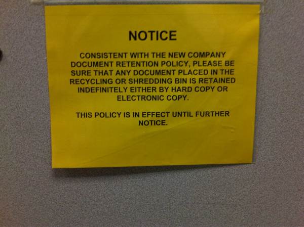 The really funny thing is that most companies follow this policy to the letter whether they know it or not, since we all keep everything forever–we just don’t have signs announcing it.