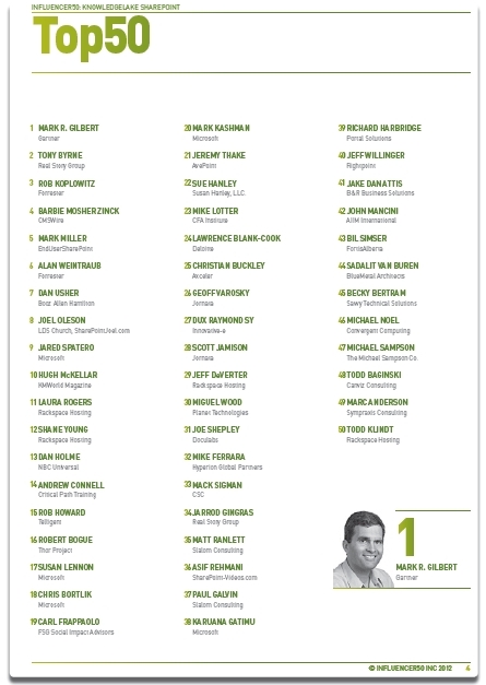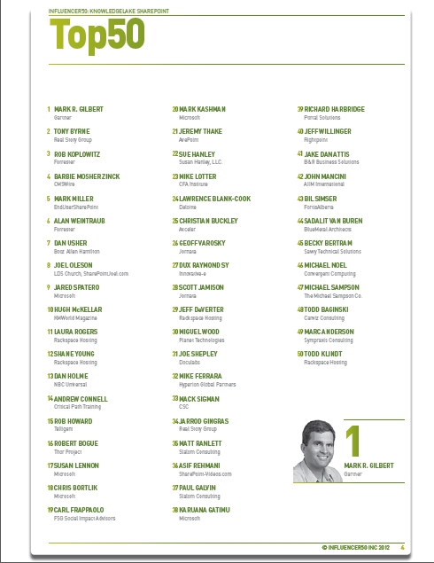 I found out over the weekend that I was named one of the Top 50 SharePoint influencers for 2012. It’s a great list of folks, and I’m honored to be included with all of them.